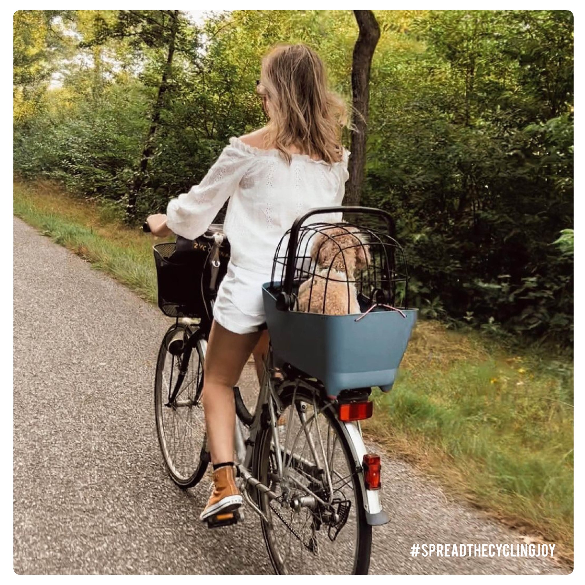 - Cestas o transportines: perfectas para perros pequeños, deben estar bien sujetas a la bicicleta y contar con un sistema de sujeción para evitar caídas. Hay modelos de diferentes tamaños y materiales. Se fijan al portaequipaje trasero o al manillar.