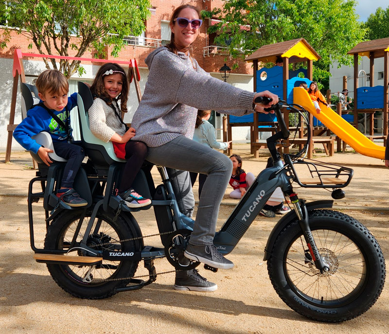 transportar 2 niños en bicicleta eléctrica - bicicleta eléctrica longtail - family bike - cargo bike - Tuc tuc Xroad Mid Motor Tucanobikes - URBAN ZERO - bicicleta eléctricas en Madrid